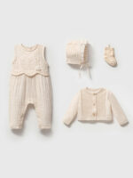 Baby-Strampler-Set aus Musselin mit Stickerei – cremefarbene Strickjacke und Mütze, 4-teilig, 3-6 Monate