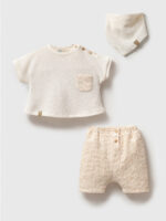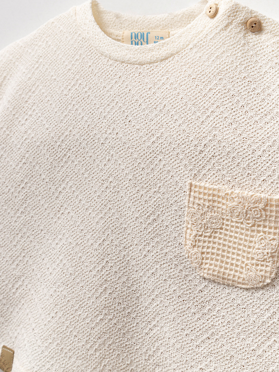 Как насчет того, чтобы добавить нотку натуральности в повседневный стиль вашего малыша? Этот комплект из 3 предметов, изготовленный из специальной фактурной ткани и украшенный вышивкой, имитирующей ручную работу, является одной из фирменных моделей Noynoy Baby, сочетающей в себе комфорт и эстетику.